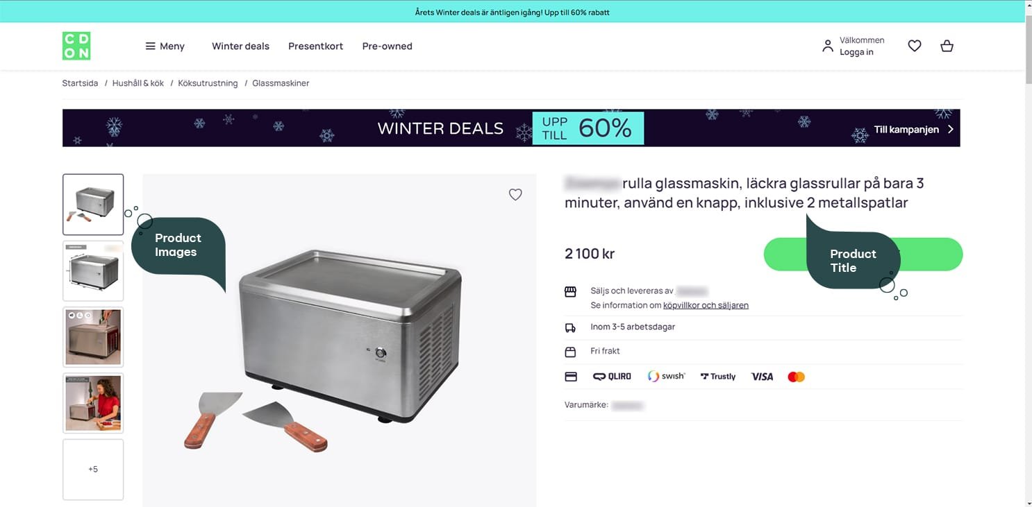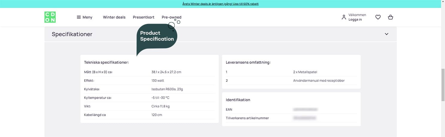 CDON product detail page of roll ice cream maker- showcasing product information, description, technical specification and features.