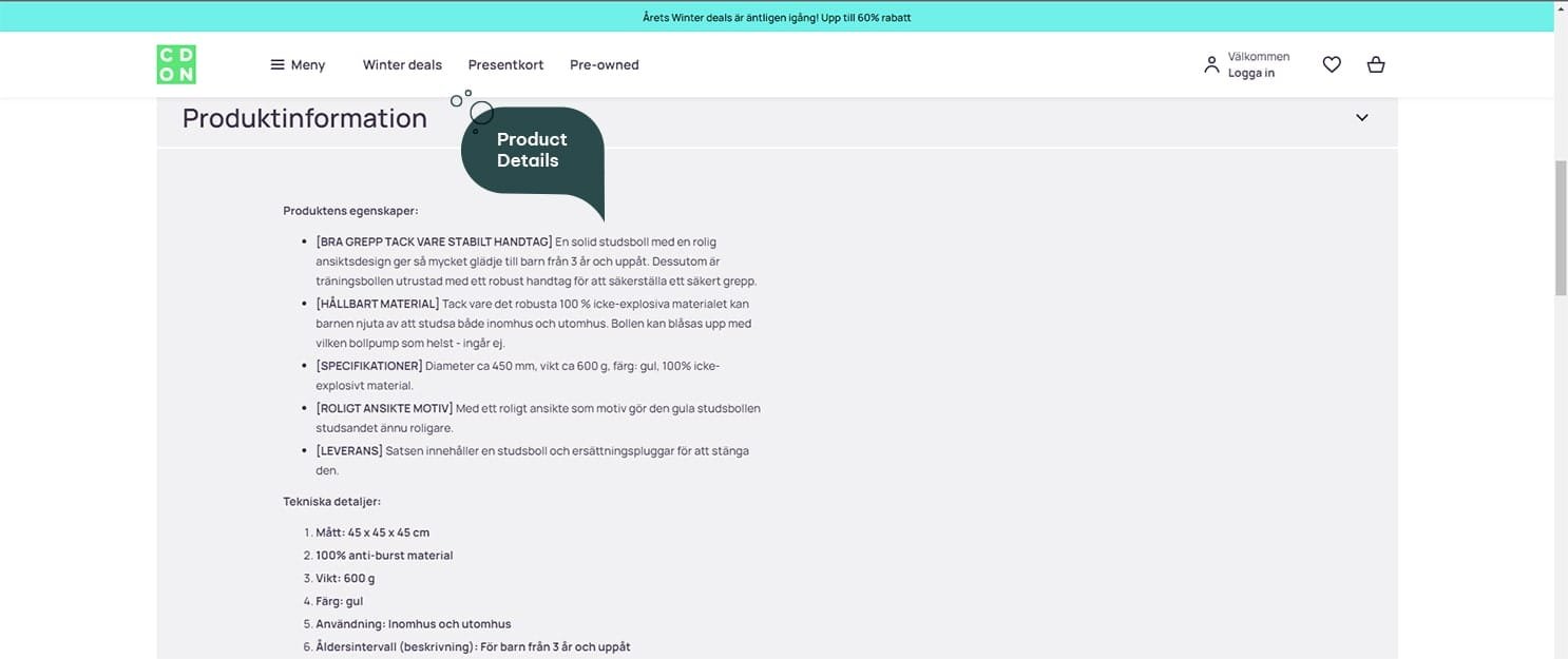 CDON product detail page of Air Bike showcasing product information, description, technical specification and features.
